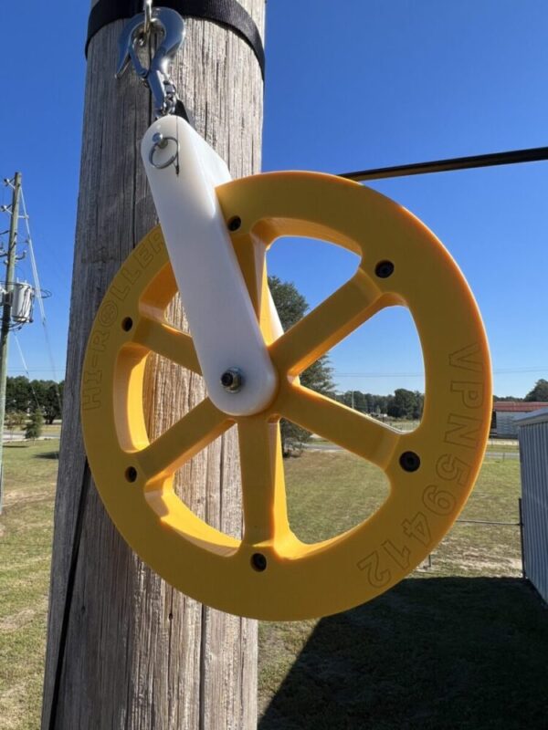 Lightweight and capable of handling loads not to exceed 1000 lbs., (Fiber Optic Cable recommended load rating is 600LBF), The Hi-Roller comes with a 3/8” Stainless Steel, multi-swivel slip hook for smooth cable transitions of any angle. Simply attach to suitable existing pole line hardware, or use the “Hi-Roller Pole Strap”, VPN: 59401 (sold separately).